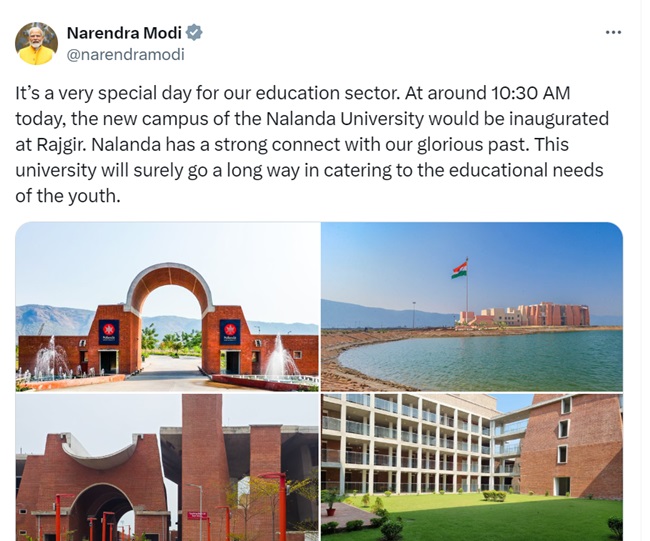नालंदा यूनिवर्सिटी पहुंचने से पहले पीएम मोदी ने अपने एक्स हैंडल पर एक पोस्ट कर संदेश दिया है। उन्होंने लिखा कि यह हमारे शिक्षा क्षेत्र के लिए बहुत खास दिन है। आज सुबह करीब 10:30 बजे राजगीर में नालंदा विश्वविद्यालय के नए परिसर का उद्घाटन किया जाएगा। नालंदा का हमारे गौरवशाली अतीत से गहरा नाता है। यह विश्वविद्यालय निश्चित रूप से युवाओं की शैक्षिक आवश्यकताओं को पूरा करने में काफी मदद करेगा।